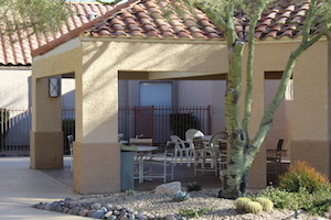 Los Portones Townhomes are one or two stories, with a two-car garage.Enjoy the quiet community pool and spa.Grab a little shade at the gazebo next to the pool.Like to hike? This wash is right outside the Los Portones Townhomes gate.