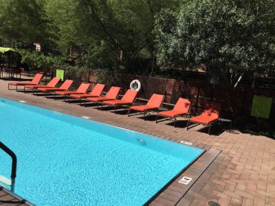 The master courtyard area has a set of spectacular fountains which gives a great view and ambient noise to the condos above.Every Optima balcony is landscaped, making this building the most unique highrise in Scottsdale.There are several pools and spas throughout Optima Camelview. You don't have to go far for a dip.Ground floor condos have patios with lush surroundings like this garden area.