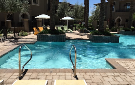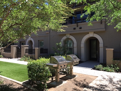 Some Diamante townhomes have a view of the pool area.Relax by the pool in one of these lounge chairs and enjoy the swaying palm trees.Gas grills are spread throughout the community.2 car garages are in the back of the building.
