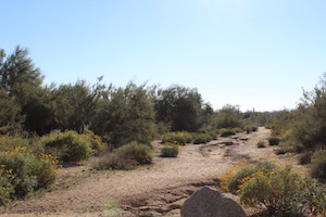 Los Portones Townhomes are one or two stories, with a two-car garage.Enjoy the quiet community pool and spa.Grab a little shade at the gazebo next to the pool.Like to hike? This wash is right outside the Los Portones Townhomes gate.