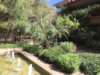 The master courtyard area has a set of spectacular fountains which gives a great view and ambient noise to the condos above.Every Optima balcony is landscaped, making this building the most unique highrise in Scottsdale.There are several pools and spas throughout Optima Camelview. You don't have to go far for a dip.Ground floor condos have patios with lush surroundings like this garden area.